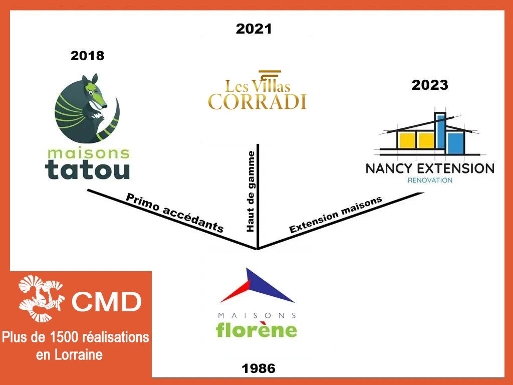 1986 à aujourd'hui : Jean-Claude CORRADI et son épouse Marguerite créent la CMD sarl et Maisons Florène. Une société de construction spécialisée dans la construction de maisons individuelles pour les particuliers avec contrat CCMI sur toute la lorraine et plus particulièrement sur la région de Nancy. Implantée depuis 39 ans , Maisons Florène a réalisé le rêve de plus de 1500 familles. Les 3 petits enfants de cette aventure Christelle COQUILLARD, Florian CORRADI et Vivien CORRADI sont maintenant à la tête de cette société depuis 2014 , celle-ci est devenue la référence de la maison individuelle sur-mesure sur Nancy ces dernières années.